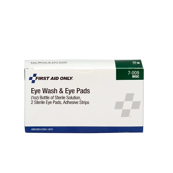 Includes Eye Flushing Solution for Irrigating the Eyes, Eye Pads and Adhesive Strips. Sold as 1 Bottle, 2 Pads, 2 Strips. Perfect for standalone first aid or as a refill for a kit.