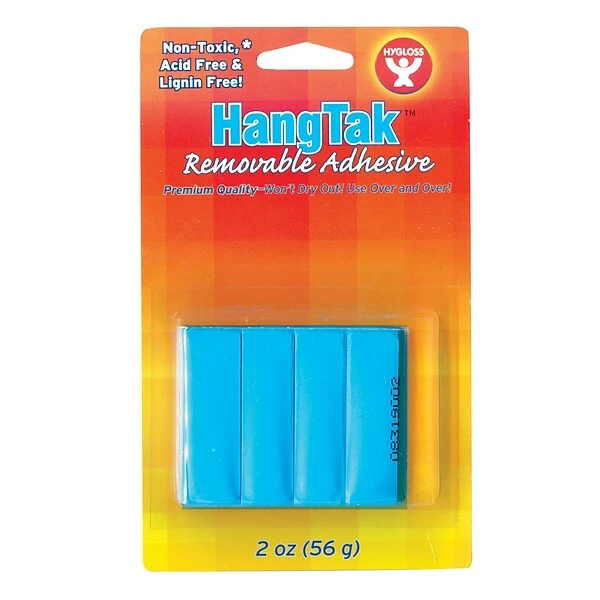 Hygloss HangTak HYG6502 2 oz Removable adhesive is suitable for holding the pictures, bulletins, art posters or any items securely in place. Smoothly used on any dry or interior surfaces. Comes in blue color for attractive look, sold as 12 per pack.