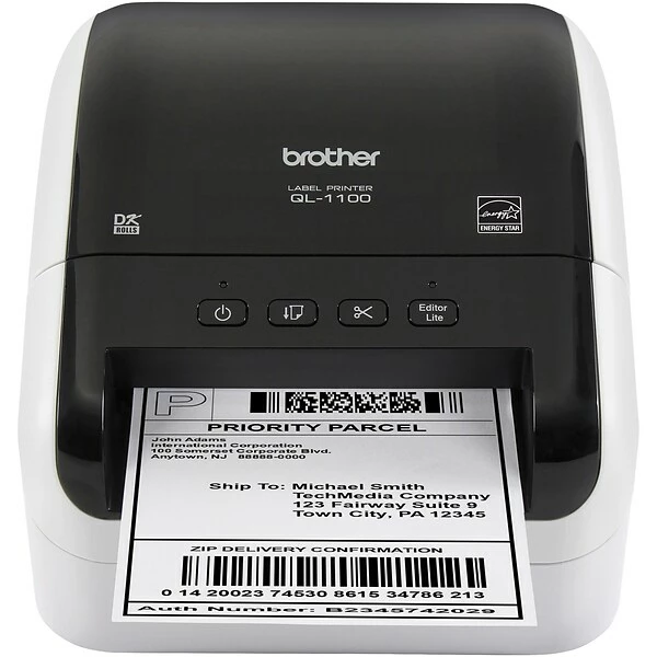 The Brother QL-1100 lets you create cost-effective paper labels for packages, envelopes, postage and more. The automatic crop function lets on-line sellers easily print product and other barcode labels from A4/Letter size label sheet templates (Windows only). It delivers fast printing up to 69 standard address labels per minute with black text at 300dpi. USB Host interface offers additional functionality. Auto cutter allows for printing 1 or multiple labels at a time, helping eliminate wasted labels sheets. The “Plug & Label” feature supports quick label printing of most basic labels – no software installation required for Windows PCs. Print from Microsoft Word/Excel/Outlook. Convenient Brother DK drop in labeling supplies. Needs no ink or toner.