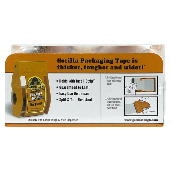Gorilla Packaging Tape Tough & Wide Refill Rolls provide the ultimate solution for moving, shipping and storing. This adhesive tape offers heavy duty strength and durability. The crystal clear packing tape is moisture and temperature resistant, and at nearly 3 inches wide you can seal boxes with just 1 strip. With its wider tape construction and problem-free tear, this tough tape is simpler to use than other packaging tapes. Easy-to-use refill rolls for use in Gorilla Packaging Tape Dispensers #6020001 and #6045002 help get the job done in no time.