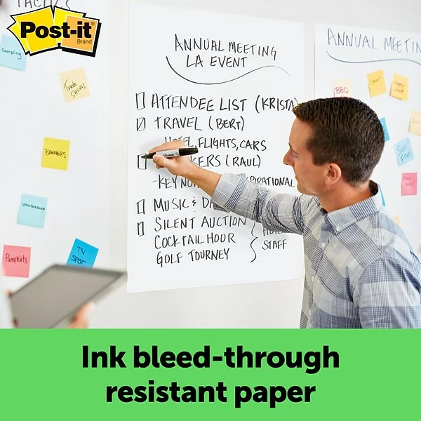- Ink-Bleed Through Resistant Paper – Large white recycled premium self-stick flip chart paper that resists marker bleed-through to keep great ideas on the page, not on what’s under the page. Made with 30% recycled material.