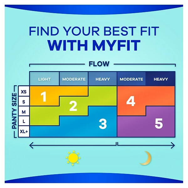 ALWAYS My Fit helps you get the best protection by tailoring your pad to fit your flow AND panty size. Use the sizing chart in the images to find your fit