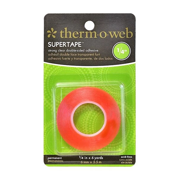 Super Tape permanent double-sided adhesive is extremely strong and bonds instantly. Great for adhering glitter, beads, and other embellishments that don’t normally adhere well with traditional glue. Available in rolls of varying width and a sheet size.